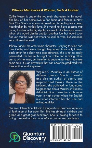 Callie Mason is one of the two main characters in this novel. She has left her hometown to find fame and fortune in New York City. She is a woman scorned and is healing from being heartbroken by her last love. She would not have guessed that during her day in the Big Apple, she would stumble upon a man whom she would dismiss and just another Joe, but would soon find out that he was not whom he said he was, but someone very different indeed. Johnny Parker, the other main character, is trying to wine and dine Callie, and even though they would have only known each other for a short time propositioned, she is not so easily persuaded. He has set his sight on Callie and is doing all he can to win her over, but the effort to capture her heart may take some time. It is an adventure that can never be predicted with love, action, and suspense. Virginia C Mckinley is an author of different genres. She is a novelist and also an author of poetry and inspirational books. Born in the Midwest, she achieved her Undergrad Degrees and also a Master's in Business Administration. It was her sophomore year in high school when her English instructor informed her that she had writing abilities. She is an International Radio Evangelist and has been a person of faith most of her adult life. She has six adult children and grand and great-grandchildren. She is looking forward to doing a sequel to Heart of a Woman as her next endeavor.