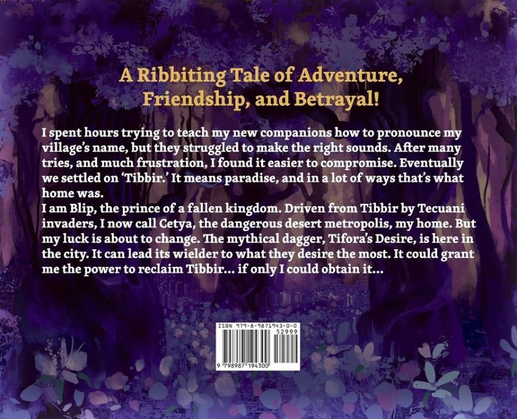 A Ribbiting Tale of Adventure, Friendship, and Betrayal! Book 1: The Introduction of the Heart of Anura Saga! I spent hours trying to teach my new companions how to pronounce my village's name, but they struggled to make the right sounds. After many tries, and much frustration, I found it easier to compromise. Eventually we settled on 'Tibbir.' It means paradise, and in a lot of ways that's what home was. I am Blip, the prince of a fallen kingdom. Driven from Tibbir by Tecuani invaders, I now call Cetya, the dangerous desert metropolis, my home. But my luck is about to change. The mythical dagger, Tifora's Desire, is here in the city. It can lead its wielder to what they desire the most. It could grant me the power to reclaim Tibbir... if only I could obtain it...