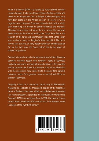 Heart of Darkness (1899) is a novella by Polish-English novelist Joseph Conrad. It tells the story of Charles Marlow, a sailor who takes on an assignment from a Belgian trading company as a ferry-boat captain in the African interior. The novel is widely regarded as a critique of European colonial rule in Africa, whilst also examining the themes of power dynamics and morality. Although Conrad does not name the river where the narrative takes place, at the time of writing the Congo Free State, the location of the large and economically important Congo River, was a private colony of Belgium's King Leopold II. Marlow is given a text by Kurtz, an ivory trader working on a trading station far up the river, who has "gone native" and is the object of Marlow's expedition. Central to Conrad's work is the idea that there is little difference between "civilised people" and "savages." Heart of Darkness implicitly comments on imperialism and racism. The novella's setting provides the frame for Marlow's story of his obsession with the successful ivory trader Kurtz. Conrad offers parallels between London ("the greatest town on earth") and Africa as places of darkness. Originally issued as a three-part serial story in Blackwood's Magazine to celebrate the thousandth edition of the magazine, Heart of Darkness has been widely re-published and translated into many languages. It provided the inspiration for Francis Ford Coppola's 1979 film Apocalypse Now. In 1998, the Modern Library ranked Heart of Darkness 67th on their list of the 100 best novels in English of the twentieth century.