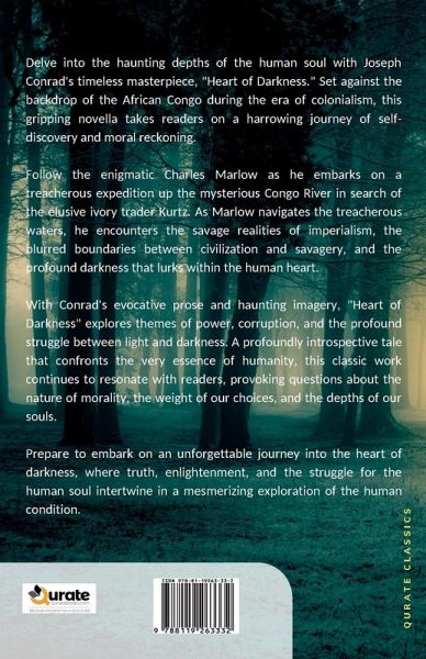 Delve into the haunting depths of the human soul with Joseph Conrad's timeless masterpiece, "Heart of Darkness." Set against the backdrop of the African Congo during the era of colonialism, this gripping novella takes readers on a harrowing journey of self-discovery and moral reckoning. Follow the enigmatic Charles Marlow as he embarks on a treacherous expedition up the mysterious Congo River in search of the elusive ivory trader Kurtz. As Marlow navigates the treacherous waters, he encounters the savage realities of imperialism, the blurred boundaries between civilization and savagery, and the profound darkness that lurks within the human heart. With Conrad's evocative prose and haunting imagery, "Heart of Darkness" explores themes of power, corruption, and the profound struggle between light and darkness. A profoundly introspective tale that confronts the very essence of humanity, this classic work continues to resonate with readers, provoking questions about the nature of morality, the weight of our choices, and the depths of our souls. Prepare to embark on an unforgettable journey into the heart of darkness, where truth, enlightenment, and the struggle for the human soul intertwine in a mesmerizing exploration of the human condition.
