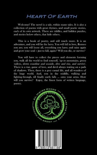 Welcome! The novel is a tale, within many tales. It isalso a collection of poems with great rhymes, and smallpoetic stories, each of its own artwork. There are riddles,and hidden puzzles, and stories below others, that hideothers. This is a book of poetry, and still much more. It is anadventure, and you will be the hero. You will fall in love,Romeo you are; you will loose all, everything you have;and raise again and grow your soul. Just to fall, again?Will you die, or survive? You will have to collect the pieces and elementsforming you, walk all the world to find yourself, 'up tomountains, green valleys, down coastline and seaside,dive and rise, and survive'. There is a war, game of love,and devil always waiting on a path of shadows. Then,there is a grey casual life, and all wonders of the hugeworld. And, you in the middle, walking andfighting through, till finally earth falls onto your arms.How will you survive? Enjoy, the finest form of writtenlanguage, poetry.