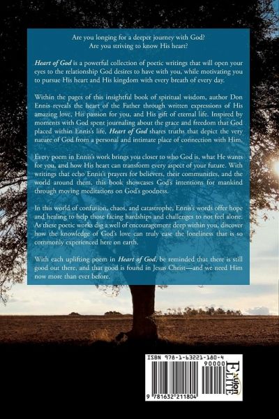 Are you longing for a deeper journey with God? Are you striving to know His heart?Heart of God is a powerful collection of poetic writings that will open your eyes to the relationship God desires to have with you, while motivating you to pursue His heart and His kingdom with every breath of every day.Within the pages of this insightful book of spiritual wisdom, author Don Ennis reveals the heart of the Father through written expressions of His amazing love, His passion for you, and His gift of eternal life. Inspired by moments with God spent journaling about the grace and freedom that God placed within Ennis's life, Heart of God shares truths that depict the very nature of God from a personal and intimate place of connection with Him.Every poem in Ennis's work brings you closer to who God is, what He wants for you, and how His heart can transform every aspect of your future. With writings that echo Ennis's prayers for believers, their communities, and the world around them, this book showcases God's intentions for mankind through moving meditations on God's goodness.In this world of confusion, chaos, and catastrophe, Ennis's words offer hope and healing to help those facing hardships and challenges to not feel alone. As these poetic works dig a well of encouragement deep within you, discover how the knowledge of God's love can truly ease the loneliness that is so commonly experienced here on earth.With each uplifting poem in Heart of God, be reminded that there is still good out there, and that good is found in Jesus Christ--and we need Him now more than ever before.