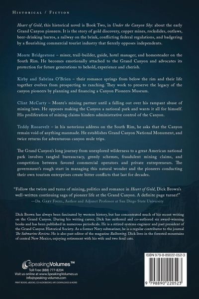 Heart of Gold, this historical novel is Book Two, in Under the Canyon Sky: about the early Grand Canyon pioneers. It is the story of gold discovery, copper mines, rockslides, outlaws, beer-drinking burros, a railway on the brink, conflicting federal regulations, and badgering by a flourishing commercial tourist industry that fiercely opposes independents. Monte Bridgestone - miner, trail-builder, guide, hotel manager, and homesteader on the South Rim. He becomes emotionally attached to the Grand Canyon and advocates its protection for future generations to behold, experience and cherish. Kirby and Sabrina O'Brien - their romance springs from below the rim and their life together evolves from prospecting to ranching. They work to preserve the legacy of the canyon pioneers by planning and financing a Canyon Pioneers Museum. Clint McCarty - Monte's mining partner until a falling out over his rampant abuse of mining laws. He opposes making the Canyon a national park and wants it all for himself. His proliferation of mining claims hinders administrative control of the Canyon. Teddy Roosevelt - in his notorious address on the South Rim, he asks that the Canyon remain void of anything manmade. He establishes Grand Canyon National Monument, and twice returns for adventurous canyon mule trips. "Follow the twists and turns of mining, politics and romance in Heart of Gold, Dick Brown's well-written continuing saga of pioneer life at the Grand Canyon. A definite page turner!" -Dr. Gary Fogel, Author and Adjunct Professor at San Diego State UniversityThe Grand Canyon's long journey from unexplored wilderness to a great American national park involves tangled bureaucracy, greedy schemes, fraudulent mining claims, and competition between favored commercial operators and private entrepreneurs. The government's rough start in managing this natural wonder and the pioneers conducting their own tourism enterprises create bitter conflicts that last for decades.