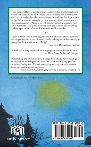 To an outsider, Hazel Green, Kentucky, seems to be just another small town whose only purpose is to fill the empty spaces on a map. When fifteen-year-old Cameo's mother forces her to move there, she finds out that there is more to this little town than meets the eye. In a stunning tale of mystery woven into suspense, Heart of Hazel Green tells the story of how a young girl from LA is thrust into a sticky web of secrecy involving an unsolved kidnapping and the repercussions of death that twist the world around her. "Heart of Hazel Green is a thrilling mystery that takes hold of your heart and teaches you the importance of friends, family and forgiveness. Pearson may be young, but she knows what she's doing." - Tara Creel, Deseret News Reviewer "A fresh new writing talent with an intriguing and beautiful narrative voice." - Marie Tarbet, Author and Composer "Captivating! This book has a great message about life and how we each get to choose how we will spend our time. It's a book about letting go of the world and finding love. It's both an engaging and easy read-the mystery keeps you wanting to turn the pages." - Cathy Chamberlain, Managing Director of Research, Deseret Book
