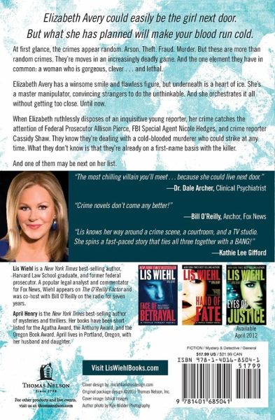 The Triple Threat Club novels follow three fiercely intelligent women-a TV reporter, a Federal prosecutor and an FBI agent-as they investigate crimes as current as today's headlines. The Triple Threat women have faced intense situations before...but never such a cunningly cold-blooded murderer. Elizabeth Avery is a stunningly beautiful woman. But her perfectly managed exterior hides the ice cold heart of a killer. She ingeniously manipulates everyone who crosses her path to do exactly as she wishes--from crime reporter Cassidy Shaw, who thinks Elizabeth is her new best friend, to a shy young man Elizabeth persuades to kill for her. As Elizabeth leaves a trail of bodies in her wake, Federal prosecutor Allison Pierce and FBI agent Nicole Hedges must piece together clues from seemingly unrelated crimes. Can they stop her before she reaches her unthinkable, ultimate end-game?