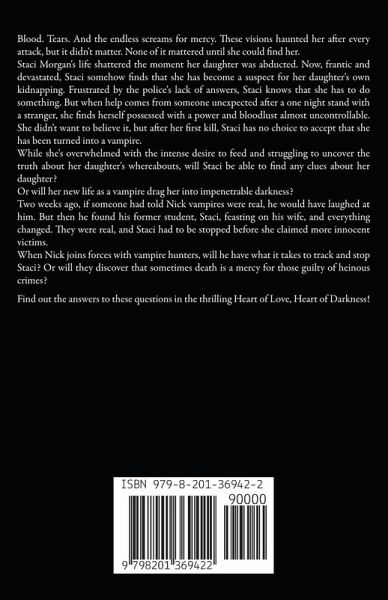Blood. Tears. And the endless screams for mercy. These visions haunted her after every attack, but it didn't matter. None of it mattered until she could find her. Staci Morgan's life shattered the moment her daughter was abducted. Now, frantic and devastated, Staci somehow finds that she has become a suspect for her daughter's own kidnapping. Frustrated by the police's lack of answers, Staci knows that she has to do something. But when help comes from someone unexpected after a one night stand with a stranger, she finds herself possessed with a power and bloodlust almost uncontrollable. She didn't want to believe it, but after her first kill, Staci has no choice to accept that she has been turned into a vampire. While she's overwhelmed with the intense desire to feed and struggling to uncover the truth about her daughter's whereabouts, will Staci be able to find any clues about her daughter? Or will her new life as a vampire drag her into impenetrable darkness? Two weeks ago, if someone had told Nick vampires were real, he would have laughed at him. But then he found his former student, Staci, feasting on his wife, and everything changed. They were real, and Staci had to be stopped before she claimed more innocent victims. When Nick joins forces with vampire hunters, will he have what it takes to track and stop Staci? Or will they discover that sometimes death is a mercy for those guilty of heinous crimes? Find out the answers to these questions in the thrilling Heart of Love, Heart of Darkness!