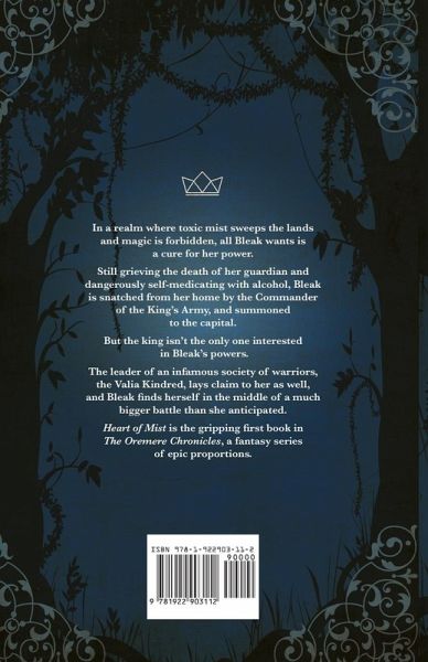 In a realm where toxic mist sweeps the lands and magic is forbidden, all Bleak wants is a cure for her power. Still grieving the death of her guardian and dangerously self-medicating with alcohol, Bleak is snatched from her home by the Commander of the King's Army, and summoned to the capital. But the king isn't the only one interested in Bleak's powers. The leader of an infamous society of warriors, the Valia Kindred, lays claim to her as well, and Bleak finds herself in the middle of a much bigger battle than she anticipated. Heart of Mist is the gripping first book in The Oremere Chronicles, a fantasy series of epic proportions.
