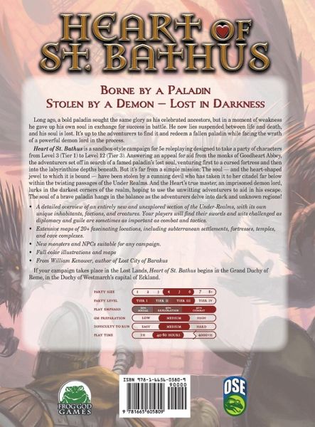 Heart of St. Bathus Borne by a Paladin, Stolen by a Demon - Lost in Darknessss Long ago, a bold paladin sought the same glory as his celebrated ancestors, but in a moment of weakness he gave up his own soul in exchange for success in battle. He now lies suspended between life and death, and his soul is lost. It's up to the adventurers to find it and redeem a fallen paladin while facing the wrath of a powerful demon lord in the process. Heart of St. Bathus is a sandbox-style campaign for 5e roleplaying designed to take a party of characters from Level 3 (Tier 1) to Level 12 (Tier 3). Answering an appeal for aid from the monks of Goodheart Abbey, the adventurers set off in search of a famed paladin's lost soul, venturing first to a cursed fortress and then into the labyrinthine depths beneath. But it's far from a simple mission: The soul - and the heart-shaped jewel to which it is bound - have been stolen by a cunning devil who has taken it to her citadel far below within the twisting passages of the Under Realms. And the Heart's true master, an imprisoned demon lord, lurks in the darkest corners of the realm, hoping to use the unwitting adventurers to aid in his escape. The soul of a brave paladin hangs in the balance as the adventurers delve into dark and unknown regions!A detailed overview of an entirely new and unexplored section of the Under-Realms, with its own unique inhabitants, factions, and creatures. Your players will find their swords and wits challenged as diplomacy and guile are sometimes as important as combat and tactics. Extensive maps of 20+ fascinating locations, including subterranean settlements, fortresses, temples, and cave complexes. New monsters and NPCs suitable for any campaign. Full-color illustrations and maps From William Kenower, author of Lost City of Barakus If your campaign takes place in the Lost Lands, Heart of St. Bathus begins in the Grand Duchy of Reme, in the Duchy of Westmarch's capital of Eckland.