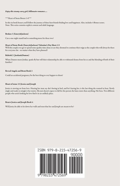 Enjoy this steamy curvy girl, billionaire romance..... ****Heart of Stone Boxset 1-6**** In this six book boxset you'll follow the journey of three best friends finding love and happiness. Also, includes 4 Bonus scenes. Note: This series contains explicit content and adult language. Broken 1 (Emery&Jackson) Can a one-night stand lead to something more for these two? Heart of Stone Book (Emery&Jackson) Valentine's Day Short 1.5 Will this couple ever get to spend some quality time alone or are they doomed to continue their reign as the couple who will always be there for everyone else - no matter what they have planned? Rebirth 2 (Jordan&Damon) When Damon meets Jordan, sparks fly but will their relationship be able to withstand drama from his ex and the blending of both of their families? Reveal Angela and Brent Book 3 Could an accidental pregnancy be the best thing to ever happen to them? Heart of stone 3.5 Jessica and Joseph Jessica is moving on from love. Hearing her man say she's boring in bed, and he's leaving her, is the last thing she wanted to hear. Newly single and ready to mingle is her motto. She just doesn't expect to fall for the person she hates more than anything. Her boss. Two different people who aren't looking for love find it in an unlikely place. Renew Jessica and Joseph Book 4 Will Jessica be able to let down her walls and trust that her and Joseph are meant to be?