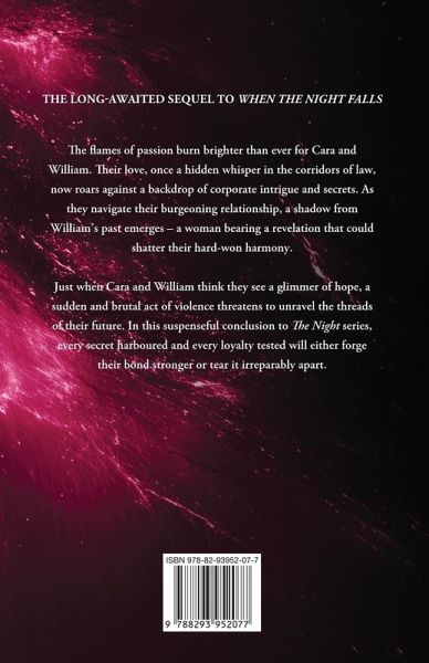 The long-awaited sequel to When The Night Falls. In the final act of The Night series, the flames of passion burn brighter than ever for Cara and William. Their love, once a hidden whisper in the corridors of law, now roars against a backdrop of corporate intrigue and secrets. As they navigate their burgeoning relationship, a shadow from William's past emerges - a woman bearing a revelation that could shatter their hard-won harmony. Just when Cara and William think they see a glimmer of hope, a sudden and brutal act of violence threatens to unravel the threads of their future. In this suspenseful conclusion, every secret harboured and every loyalty tested, will either forge their bond stronger or tear it irreparably apart.