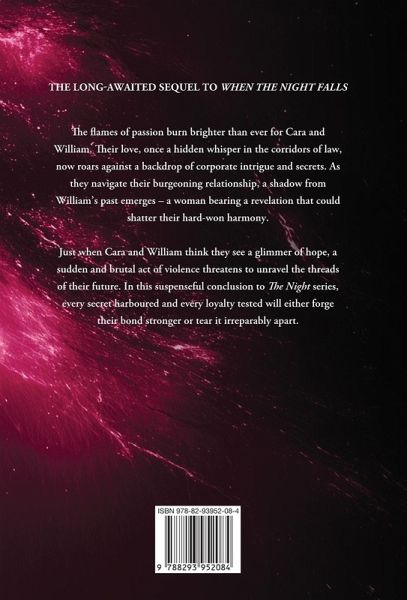 The long-awaited sequel to When The Night Falls The flames of passion burn brighter than ever for Cara and William. Their love, once a hidden whisper in the corridors of law, now roars against a backdrop of corporate intrigue and secrets. As they navigate their burgeoning relationship, a shadow from William's past emerges - a woman bearing a revelation that could shatter their hard-won harmony. Just when Cara and William think they see a glimmer of hope, a sudden and brutal act of violence threatens to unravel the threads of their future. In this suspenseful conclusion to The Night series, every secret harboured and every loyalty tested, will either forge their bond stronger or tear it irreparably apart. Content warnings can be found inside the book or on the author's website.