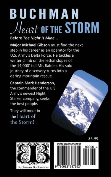 A Night Stalkers origin story- Before The Night Is Mine... Major Michael Gibson must find the next step in his career as an operator for the U.S. Army's Delta Force. He tackles a winter climb on the lethal slopes of the 14,000' tall Mt. Rainier. His solo journey of discovery turns into a daring mountain rescue. Captain Mark Henderson, the commander of the U.S. Army's newest Night Stalker company, seeks the best people. They will meet in the Heart of the Storm!