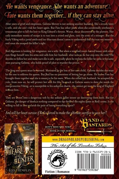 He wants vengeance. She wants redemption. An assassin wants them both dead. In this story enjoy Medieval Romance, a Viking hero, forced proximity, fated to be, destiny, hero's love at first sight. After years of grief and emptiness, Galiena Mercer is not seeking another husband. She's already been a wife, and she can't risk her heart again. But Fate has other plans when she accidentally overhears a treasonous plot to kill the heir to King Edward's throne. Worse, she is discovered by the plotters. Her only immediate means of escape is to run into a crowd and then, into the arms of a stranger. But the burly Viking with a jovial smile and ice-blue eyes doesn't seem to understand that the ruse was meant to end once she escaped the killer's sight. Red Algarssen is looking for vengeance, not a wife. But when a terrified raven-haired beauty with silver eyes flings herself into his arms and calls him her husband, what is he to do but step into the role? He decides to follow her and make sure she is safe, especially when he realizes the killer he seeks is the same man pursuing Galiena, who holds proof of plan to murder the prince. The king and queen must be warned. Motivated by the loss of her own child, Galiena decides she must be the one to address the queen. But Red has no intention of letting her go alone. He knows Fate has brought them together and she is meant to be his mate. When she called him husband, he accepted the role; from now on, he will protect her with his life. As much as Galiena wants to deny she needs the overprotective Viking, or is susceptible to his seductive charm, she cannot get near the king of England without him. They are drawn into a dangerous web by the sadistic killer intent on destroying them both. But for Galiena, the danger of death is nothing compared to the thrill of the nights spent in Red's arms. Is she willing to fall in love and risk the pain of losing everything again? And will her heart survive if Red is forced to make the ultimate sacrifice to save her? Band of Bastards Book 1 - Heart of the Hawk Book 2 - Heart of the Viking Book 3 - Heart of the Hunter