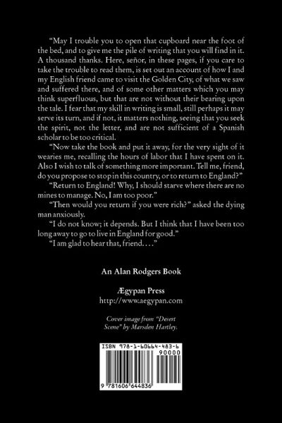 "May I trouble you to open that cupboard near the foot of the bed, and to give me the pile of writing that you will find in it. A thousand thanks. Here, señor, in these pages, if you care to take the trouble to read them, is set out an account of how I and my English friend came to visit the Golden City, of what we saw and suffered there, and of some other matters which you may think superfluous, but that are not without their bearing upon the tale. I fear that my skill in writing is small, still perhaps it may serve its turn, and if not, it matters nothing, seeing that you seek the spirit, not the letter, and are not sufficient of a Spanish scholar to be too critical. "Now take the book and put it away, for the very sight of it wearies me, recalling the hours of labor that I have spent on it. Also I wish to talk of something more important. Tell me, friend, do you propose to stop in this country, or to return to England?" "Return to England! Why, I should starve where there are no mines to manage. No, I am too poor." "Then would you return if you were rich?" asked the dying man anxiously. "I do not know; it depends. But I think that I have been too long away to go to live in England for good." "I am glad to hear that, friend. . . ."