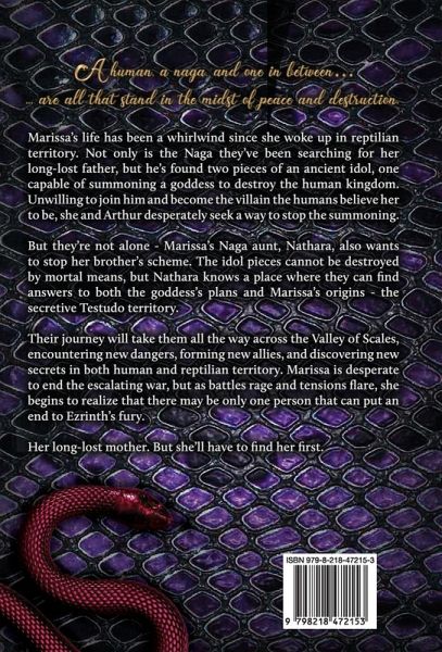A human, a Naga, and one in between... are all that stand in the midst of peace and destruction. Marissa's life has been a whirlwind since she woke up in reptilian territory. Not only is the Naga they've been searching for her long-lost father, but he's found two pieces of an ancient idol, one capable of summoning a goddess to destroy the human kingdom. Unwilling to join him and become the villain the humans believe her to be, she and Arthur desperately seek a way to stop the summoning. But they're not alone - Marissa's Naga aunt, Nathara, also wants to stop her brother's scheme. The idol pieces cannot be destroyed by mortal means, but Nathara knows a place where they can find answers to both the goddess's plans and Marissa's origins - the secretive Testudo territory. Their journey will take them all the way across the Valley of Scales, encountering new dangers, forming new allies, and discovering new secrets in both human and reptilian territory. Marissa is desperate to end the escalating war, but as battles rage and tensions flare, she begins to realize that there may be only one person that can put an end to Ezrinth's fury. Her long-lost mother. But she'll have to find her first. The Valley of Scales Saga is a young adult, high stakes, slow-burn fantasy romance trilogy filled with morally grey characters, found family, multiple monster romances, and lots of reptiles based on real-life species. Perfect for reptile lovers who enjoy fantasy romance but want a story where the snake is a hero. "I love the characters. Not just Marissa and Author who are adorable but I love Thomas and Nathara just as much. And....The ending! Gosh I can't wait to read the conclusion." - Goodreads Review