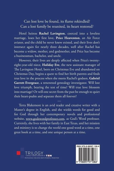 Can lost love be found, its flame rekindled? Can a lost family be reunited, its heart restored? Hotel heiress Rachel Lavington, coerced into a loveless marriage, loses her first love, Price Heaventon, an Air Force aviator, and the child he never knew existed, and their lives don't intersect again for nearly three decades, well after Rachel has become a widow, mother, and godmother, and Price has become a businessman, bachelor, and uncle. However, their lives are deeply affected when Price's twenty-eight-year-old niece, Holiday Eve, the new assistant manager of The Lavington Hotel, born on Christmas Eve and abandoned on Christmas Day, begins a quest to find her birth parents and finds true love in the process when she meets Rachel's godson, Gabriel Garrett Evergrace, a renowned genealogy investigator. Will lost love triumph, bearing the test of time? Will true love blossom into marriage? Or will one secret from the past be enough to quiet their heart-psalm and separate them all forever?