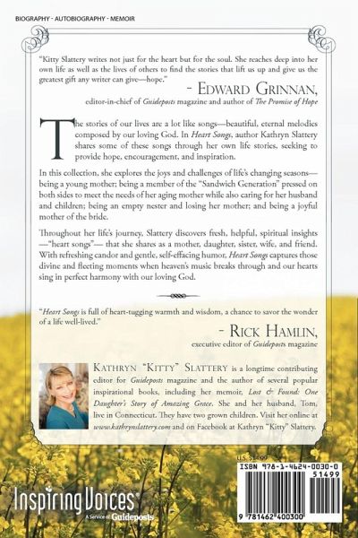 The stories of our lives are a lot like songs-beautiful, eternal melodies composed by our loving God. In Heart Songs, author Kathryn Slattery shares some of these songs through her own life stories, seeking to provide hope, encouragement, and inspiration. In this collection, she explores the joys and challenges of life's changing seasons-being a young mother; being a member of the "Sandwich Generation" pressed on both sides to meet the needs of her aging mother while also caring for her husband and children; being an empty nester and losing her mother; and being a joyful mother of the bride. Throughout her life's journey, Slattery discovers fresh, helpful, spiritual insights-"heart songs"-that she shares as a mother, daughter, sister, wife, and friend. With refreshing candor and gentle, self-effacing humor, Heart Songs captures those divine and fleeting moments when heaven's music breaks through and our hearts sing in perfect harmony with our loving God. Praise for Heart Songs "Kitty Slattery writes not just for the heart but for the soul. She reaches deep into her own life as well as the lives of others to find the stories that lift us up and give us the greatest gift any writer can give-hope." -Edward Grinnan, editor-in-chief of Guideposts magazine and author of The Promise of Hope "Heart Songs is full of heart-tugging warmth and wisdom, a chance to savor the wonder of a life well-lived." -Rick Hamlin, executive editor of Guideposts magazine