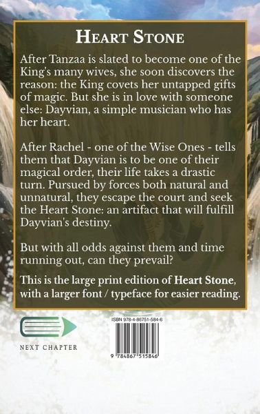After Tanzaa is slated to become one of the King's many wives, she soon discovers the reason: the King covets her untapped gifts of magic. But she is in love with someone else: Dayvian, a simple musician who has her heart. After Rachel - one of the Wise Ones - tells them that Dayvian is to be one of their magical order, their life takes a drastic turn. Pursued by forces both natural and unnatural, they escape the court and seek the Heart Stone: an artifact that will fulfill Dayvian's destiny. But with all odds against them and time running out, can they prevail? This is the large print edition of Heart Stone, with a larger font / typeface for easier reading.