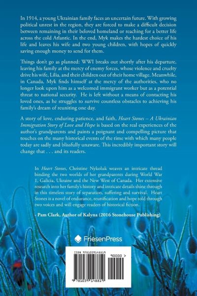 In 1914, a young Ukrainian family faces an uncertain future. With growing political unrest in the region, they are forced to make a difficult decision between remaining in their beloved homeland or reaching for a better life across the cold Atlantic. In the end, Myk makes the hardest choice of his life and leaves his wife and two young children, with hopes of quickly saving enough money to send for them. Things don't go as planned: WWI breaks out shortly after his departure, leaving his family at the mercy of enemy forces, whose violence and cruelty drive his wife, Lilia, and their children out of their home village. Meanwhile, in Canada, Myk finds himself at the mercy of the authorities, who no longer look upon him as a welcomed immigrant worker but as a potential threat to national security. He is left without a means of contacting his loved ones, as he struggles to survive countless obstacles to achieving his family's dream of reuniting one day. A story of love, enduring patience, and faith, Heart Stones - A Ukrainian Immigration Story of Love and Hope is based on the real experiences of the author's grandparents and paints a poignant and compelling picture that touches on the many historical events of the time with which many people today are sadly and blissfully unaware. This incredibly important story will change that... and its readers.