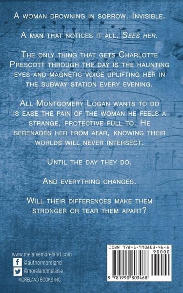 Indulge in this romantic, opposites-attract journey from New York Times bestselling author Melanie Moreland A woman drowning in sorrow. Invisible. The man that sees it all. Sees her. The only thing that gets Charlotte Prescott through the day is the haunting eyes and magnetic voice that uplifts her in the subway station every evening. All Montgomery Logan wants to do is ease the pain of the woman he feels a strange, protective draw to. He serenades her from afar, knowing their worlds will never intersect. Until the day they do. And everything changes. Will their differences make them stronger or tear them apart?