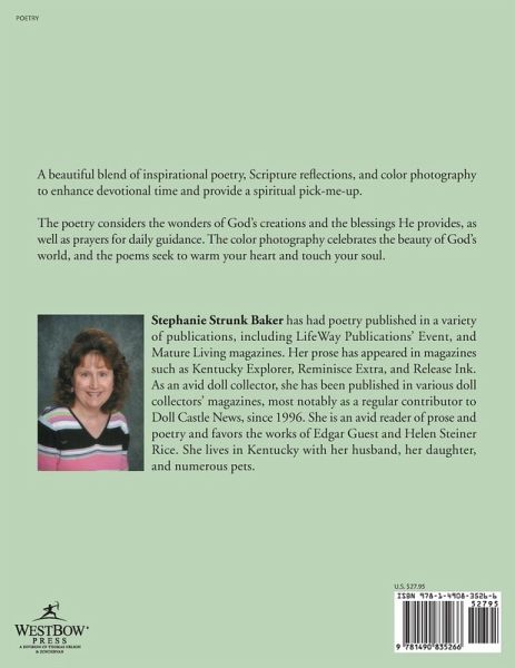 A beautiful blend of inspirational poetry, Scripture reflections, and color photography to enhance devotional time and provide a spiritual pick-me-up. The poetry considers the wonders of God?s creations and the blessings He provides, as well as prayers for daily guidance. The color photography celebrates the beauty of God?s world, and the poems seek to warm your heart and touch your soul.