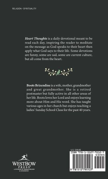 Heart Thoughts is a daily devotional meant to be read each day, inspiring the reader to meditate on the message as God speaks to their heart then apply what God says to their life. Some devotions are funny, some are sad, some are current culture, but all come from the heart.