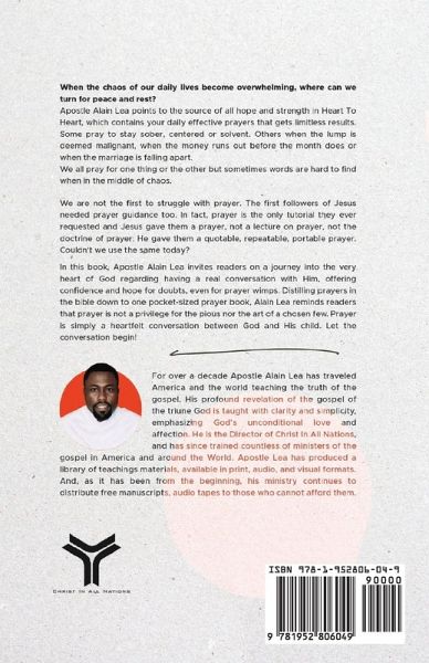 When the chaos of our daily lives become overwhelming, where can we turn for peace and rest? Apostle Alain Lea points to the Source of all hope and strength in Heart to Heart, which contains sixty guided prayers. We all pray . . . some. We pray to stay sober, centered or solvent. When the lump is deemed malignant, when the money runs out before the month does or when the marriage is falling apart, we pray. But wouldn't we like to pray more? Better? Stronger? With more fire, faith, and fervency? We have kids to feed, bills to pay, deadlines to meet. The calendar pounces on our good intentions like a tiger on a rabbit. What about our checkered history with prayer: uncertain words, unmet expectations and unanswered requests? We are not the first to struggle with prayer. The first followers of Jesus needed prayer guidance too. In fact, prayer is the only tutorial they ever requested and Jesus gave them a prayer, not a lecture on prayer, not the doctrine of prayer; He gave them a quotable, repeatable, portable prayer. Couldn't we use the same? In Heart to Heart, best-selling author Dr. Alain Lea invites readers on a journey to the very heart of Biblical prayer, offering hope for doubts and confidence, even for prayer wimps. Distilling prayers in the Bible down to one pocket-sized prayer, Alain reminds readers that prayer is not a privilege for the pious nor the art of a chosen few. Prayer is simply a heartfelt conversation between God and his child. Let the conversation begin.