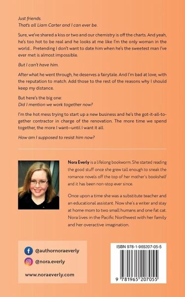 Just friends. That's all Liam Carter and I can ever be. Sure, we've shared a kiss or two and our chemistry is off the charts. And yeah, he's too hot to be real and he looks at me like I'm the only woman in the world... Pretending I don't want to date him when he's the sweetest man I've ever met is almost impossible. But I can't have him. After what he went through, he deserves a fairytale. And I'm bad at love, with the reputation to match. Add those to the rest of the reasons why I should keep my distance. But here's the big one: Did I mention we work together now? I'm the hot mess trying to start up a new business and he's the got-it-all-together contractor in charge of the renovation. The more time we spend together, the more I want-until I want it all. How am I supposed to resist him now?