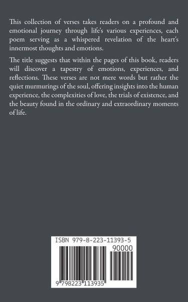 This collection of verses takes readers on a profound and emotional journey through life's various experiences, each poem serving as a whispered revelation of the heart's innermost thoughts and emotions. The title suggests that within the pages of this book, readers will discover a tapestry of emotions, experiences, and reflections. These verses are not mere words but rather the quiet murmurings of the soul, offering insights into the human experience, the complexities of love, the trials of existence, and the beauty found in the ordinary and extraordinary moments of life.
