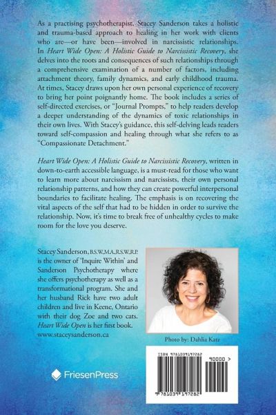 As a practising psychotherapist, Stacey Sanderson takes a holistic and trauma-based approach to healing in her work with clients who are-or have been-involved in narcissistic relationships. In Heart Wide Open: A Holistic Guide to Narcissistic Recovery, she delves into the roots and consequences of such relationships through a comprehensive examination of a number of factors, including attachment theory, family dynamics, and early childhood trauma. At times, Stacey draws upon her own personal experience of recovery to bring her point poignantly home. The book includes a series of self-directed exercises, or "Journal Prompts," to help readers develop a deeper understanding of the dynamics of toxic relationships in their own lives. With Stacey's guidance, this self-delving leads readers toward self-compassion and healing through what she refers to as "Compassionate Detachment." Heart Wide Open: A Holistic Guide to Narcissistic Recovery, written in down-to-earth accessible language, is a must-read for those who want to learn more about narcissism and narcissists, their own personal relationship patterns, and how they can create powerful interpersonal boundaries to facilitate healing. The emphasis is on recovering the vital aspects of the self that had to be hidden in order to survive the relationship. Now, it's time to break free of unhealthy cycles to make room for the love you deserve.