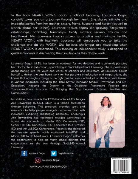 By sharing intimate stories from her mother, sisters, friend, husband and herself, as well as about her father, Laurance Bogar candidly takes you on a trip through her heart. These narratives include grieving, forgiveness, relationships, parenting, friendships, family matters, secrecy, trauma and heartbreak. Her openness inspires others to practice heart work. She believes challenges are rewarding when HEART WORK is embraced. Laurance will encourage you to take the challenge and do the WORK. This training or independent study is designed to guide individuals in discovering their solutions as they do the work.