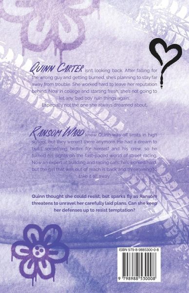 Quinn Carter isn't looking back. After falling for the wrong guy and getting burned, she's planning to stay far away from trouble. She worked hard to leave her reputation behind. Now in college and starting fresh, she's not going to let any 'bad boy' ruin things again. Especially not the one she always dreamed about. Ransom Ward knew Quinn was off limits in high school, but they weren't there anymore. He had a dream to build something better for himself and his crew, so he turned his sights on the fast-paced world of car racing. Now an expert at building and racing cars, he's worked hard, but the girl that was out of reach is back and threatening to take it all away. Quinn thought she could resist, but sparks fly as Ransom threatens to unravel her carefully laid plans. Can she keep her defenses up to resist temptation?