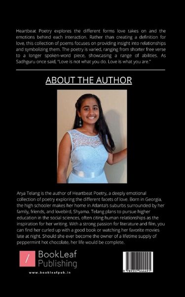 Heartbeat Poetry explores the different forms love takes on and the emotions behind each interaction. Rather than creating a definition for love, this collection of poems focuses on providing insight into relationships and symbolizing them. The poetry is varied, ranging from shorter free verse to a longer spoken-word piece, showcasing a range of abilities. As Sadhguru once said, "Love is not what you do. Love is what you are."