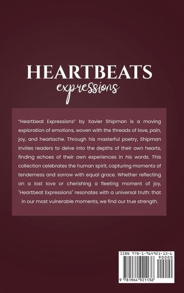 "Heartbeat Expressions" by Xavier Shipman is a moving exploration of emotions, woven with the threads of love, pain, joy, and heartache. Through his masterful poetry, Shipman invites readers to delve into the depths of their own hearts, finding echoes of their own experiences in his words. This collection celebrates the human spirit, capturing moments of tenderness and sorrow with equal grace. Whether reflecting on a lost love or cherishing a fleeting moment of joy, "Heartbeat Expressions" resonates with a universal truth: that in our most vulnerable moments, we find our true strength.