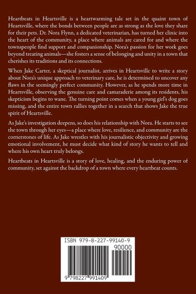 Heartbeats in Heartsville is a heartwarming tale set in the quaint town of Heartsville, where the bonds between people are as strong as the love they share for their pets. Dr. Nora Flynn, a dedicated veterinarian, has turned her clinic into the heart of the community, a place where animals are cared for and where the townspeople find support and companionship. Nora's passion for her work goes beyond treating animals-she fosters a sense of belonging and unity in a town that cherishes its traditions and its connections. When Jake Carter, a skeptical journalist, arrives in Heartsville to write a story about Nora's unique approach to veterinary care, he is determined to uncover any flaws in the seemingly perfect community. However, as he spends more time in Heartsville, observing the genuine care and camaraderie among its residents, his skepticism begins to wane. The turning point comes when a young girl's dog goes missing, and the entire town rallies together in a search that shows Jake the true spirit of Heartsville. As Jake's investigation deepens, so does his relationship with Nora. He starts to see the town through her eyes-a place where love, resilience, and community are the cornerstones of life. As Jake wrestles with his journalistic objectivity and growing emotional involvement, he must decide what kind of story he wants to tell and where his own heart truly belongs. Heartbeats in Heartsville is a story of love, healing, and the enduring power of community, set against the backdrop of a town where every heartbeat counts.