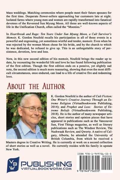 Mass weddings. Matching ceremonies where people meet their future spouses for the first time. Desperate flower-sellers approaching bar customers late at night. Isolated farms where young men and women are rapidly transformed into fanatical devotees of the Reverend Sun Myung Moon. All these are well-known aspects of life in the Unification Church, often called the "Moonies." In Heartbreak and Rage: Ten Years Under Sun Myung Moon, a Cult Survivor's Memoir, K. Gordon Neufeld recalls his participation in all of these events in a powerful and engrossing, yet sometimes wistful and tender, memoir. Even when he was rejected by the woman Moon chose for his bride, and by the church to which he was dedicated, he refused to give up. This is an unforgettable story of persistence, devotion, love and loss. Now, in this new second edition of his memoir, Neufeld brings the reader up to date, by recounting the wonderful life and love he has found following publication of the first edition. Though the first edition ends on a pensive, yet slightly sad note, the second edition is much more reassuring, showing that even the most difficult circumstances, once endured, can lead to a life of creative fire and redeeming love.