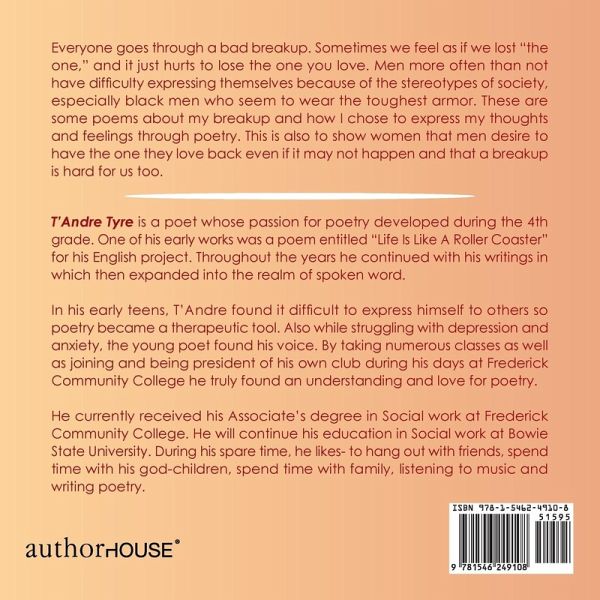 Everyone goes through a bad breakup. Sometimes we feel as if we lost the one, and it just hurts to lose the one you love. Men more often than not have difficulty expressing themselves because of the stereotypes of society, especially black men who seem to wear the toughest armor. These are some poems about my breakup and how I chose to express my thoughts and feelings through poetry. This is also to show women that men desire to have the one they love back even if it may not happen and that a breakup is hard for us too.