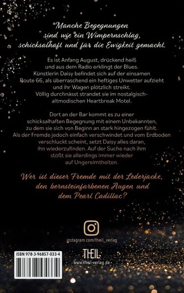 "Manche Begegnungen sind wie ein Wimpernschlag, schicksalhaft und für die Ewigkeit gemacht." Es ist Anfang August, drückend heiß und aus dem Radio erklingt der Blues. Künstlerin Daisy befindet sich auf der einsamen Route 66, als überraschend ein heftiges Unwetter aufzieht und ihr Wagen plötzlich streikt. Völlig durchnässt strandet sie im nostalgisch, altmodischen Heartbreak Motel. Dort an der Bar kommt es zu einer schicksalhaften Begegnung mit einem Unbekannten, zu dem sie sich von Beginn an stark hingezogen fühlt. Als der Fremde jedoch einfach verschwindet und vom Erdboden verschluckt scheint, setzt Daisy alles daran, ihn wiederzufinden. Auf der Suche nach ihm, stößt sie allerdings immer wieder auf Ungereimtheiten. Wer ist dieser Fremde mit der Lederjacke, den bernsteinfarbenen Augen und dem Pearl Cadillac?"