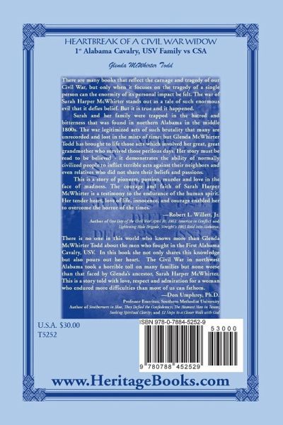 In this book, Sarah Harper McWhirter tells the story of her life growing up as the oldest child in a family of fifteen children, her marriage, the wagon train trip from Smith County, Tennessee to Alabama, her children, information about her husband's family, and her experiences during and after the Civil War. Sarah's story is based on Civil War pension records and Southern Claims sworn to and signed by different friends and relatives. This book ranges from the factual to the fictionalized. The factual obviously being the facts dealing with families, dates of birth, marriage, death, and other historical events. Civil War documents and diaries were also used. The letters written to Sarah by her sons and brothers were based on official records, pension records, Thomas A. McWhirter's diary, and diaries written by 1st Alabama Cavalry, USV officers and other members who were serving alongside her sons and brothers when they wrote home. The author has made every attempt to match the fictionalized portions with the documented experiences and actions of the true Sarah Harper McWhirter. Each of the excerpts from diaries, Southern Claims, Civil War pension applications, speeches, official records, wills etc. was left in its own unique style. In some instances, the people who wrote them were illiterate but the spelling was used exactly as it was found. Vintage portraits, photographs, and pictures of period tools used during her lifetime enhance the text.