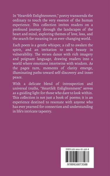 In "Heartfelt Enlightenment," poetry transcends the ordinary to touch the very essence of the human experience. This collection invites readers on a profound journey through the landscapes of the heart and mind, exploring themes of love, loss, and the search for meaning in an ever-changing world. Each poem is a gentle whisper, a call to awaken the spirit, and an invitation to seek beauty in vulnerability. The verses dance with rich imagery and poignant language, drawing readers into a world where emotions intertwine with wisdom. As the pages turn, moments of clarity emerge, illuminating paths toward self-discovery and inner peace. With a delicate blend of introspection and universal truths, "Heartfelt Enlightenment" serves as a guiding light for those who dare to look within. This collection is not just a book of poems; it is an experience destined to resonate with anyone who has ever yearned for connection and understanding in life's intricate tapestry.
