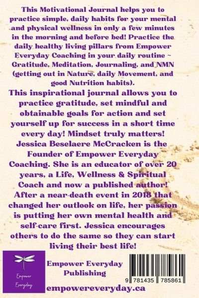 This Motivational Journal helps you to practice simple, daily habits for your mental and physical wellness in only a few minutes in the morning and before bed! Practice the daily healthy living pillars from Empower Everyday Coaching in your daily routine ~ Gratitude, Meditation, Journaling, and NMN (getting out in Nature, daily Movement, and good Nutrition habits). This inspirational journal allows you to practice gratitude, set mindful and obtainable goals for action and set yourself up for success in a short time every day! Mindset truly matters!