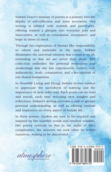 Indrani Grace's treasury of poems is a journey into the depths of self-reflection and inner revelation. Her writing is infused with warmth and practicality, offering readers a glimpse into everyday joys and insecurities, as well as consolation, acceptance, and hope in times of need. Through her exploration of themes like responsibility to others and surrender to the spirit, Indrani illuminates the universal oneness that connects us all, reminding us that we are never truly alone. Her collection embodies the personal restoration and awakenings that she has experienced, written with authenticity, truth, compassion, and a recognition of our shared humanness. In Heartfelt Living and Dying, Indrani invites readers to appreciate the sacredness of learning and the importance of daily reflection. Each poem can be read and reread, each time revealing new insights and reflections. Indrani's writing provides a path to greater personal understanding, as well as offering wisdom and inspiration on every aspect of human life. In these poems, readers are sure to be touched and inspired by her heartfelt words and timeless wisdom. Her poetry reminds us that in the midst of life's complexities, the answers we seek often lie within ourselves, waiting to be discovered.