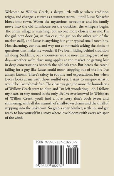 Welcome to Willow Creek, a sleepy little village where tradition reigns, and change is as rare as a summer storm-until Lucas Schaefer blows into town. When the mysterious newcomer and his family move into the old farmhouse on the outskirts, the whispers begin. The entire village is watching, but no one more closely than me. I'm the girl next door (or, in this case, the girl on the other side of the market stall), and Lucas is anything but your typical small-town boy. He's charming, curious, and way too comfortable asking the kinds of questions that make me wonder if I've been hiding behind tradition all along. Suddenly, our encounters are the most exciting part of my day-whether we're discussing apples at the market or getting lost in deep conversations beneath the old oak tree. But here's the catch: falling for a guy like Lucas could mean stepping out of the life I've always known. There's safety in routine and expectations, but when Lucas looks at me with those soulful eyes, I start to imagine what it would be like to break free. The closer we get, the more the boundaries of Willow Creek start to blur, and I'm left wondering... do I follow my heart, or stay rooted in the only life I've ever known? In Whispers of Willow Creek, you'll find a love story that's both sweet and simmering, with all the warmth of small-town charm and the thrill of stepping into the unknown. So grab a cozy blanket, settle in, and get ready to lose yourself in a story where love blooms with every whisper of the wind.