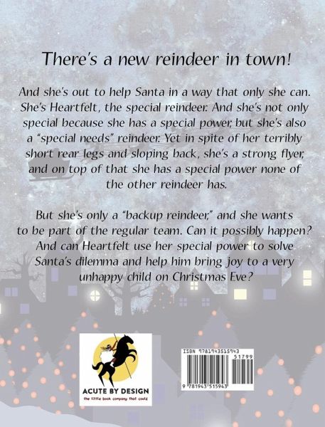 There’s a new reindeer in town! And she’s out to help Santa in a way that only she can. She’s Heartfelt, the special reindeer. And she’s not only special because she has a special power, but she’s also a "special needs" reindeer. Yet in spite of her terribly short rear legs and sloping back, she’s a strong flyer, and on top of that she has a special power none of the other reindeer has. But she’s only a "backup reindeer," and she wants to be part of the regular team. Can it possibly happen? And can Heartfelt use her special power to solve Santa’s dilemma and help him bring joy to a very unhappy child on Christmas Eve?