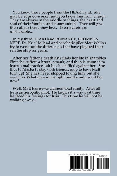 You know these people from the HEARTland. She may be your co-worker and you know him from church. They are always in the middle of things, the heart and soul of their families and communities. They will give their all for those they love. Their beliefs are unshakable. In my third HEARTland ROMANCE, PROMISES KEPT, Dr. Kris Holland and aerobatic pilot Matt Walker try to work out the differences that have plagued their relationship for years. After her father's death Kris finds her life in shambles. First she suffers a brutal assault, and then is stunned to learn a malpractice suit has been filed against her. She flies to Alaska to stay with friends, only to have Matt turn up! She has never stopped loving him, but she wonders: What man in his right mind would want her now? Well, Matt has never claimed total sanity. After all he is an aerobatic pilot. He knows it's way past time he faced his feelings for Kris. This time he will not be walking away.