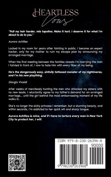 "Pull my hair harder, mia topolina. Make it hurt. I deserve it for what I'm about to do to you." Aurora Achilles Locked in my room for years after fainting in public, I become an expert hacker, only for my mother to ruin my escape plan by announcing my arranged marriage. When the first meeting between the families reveals I'm marrying the man I fainted in front of, I vow to hate him with every fiber of my being. He's the dangerously sexy, sinfully tattooed monster of my nightmares, and I'm his new plaything. Giorgio Vivaldi After weeks of mercilessly hunting the men who attacked my sisters with no new leads, I reluctantly agree to my father's demand for an arranged marriage... until the girl behind the most embarrassing moment of my life walks in. She's no longer the sickly princess I remember, but a stunning beauty, and within seconds, I'm addicted to her quick wit and sharp tongue. Aurora Achilles is mine, and if I have to torture every man in New York City to protect her, I will. Heartless Vows (Vicious Mafia Kings Book 2) is a super spicy enemies to lovers dark mafia arranged marriage romance with a jealous/possessive hero, a strong, competent female lead, and a deliciously dirty battle of wills. This story is intended for 18+ readers and includes mature content such as graphic violence, profanity, chronic illness, and other adult themes. Can be read as a standalone. HEA guaranteed.