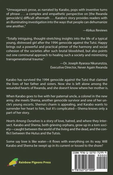 Karabo has survived the 1994 genocide against the Tutsi that claimed the lives of her father and sisters. Now she is left alone among the wounded hearts of Rwanda, and she doesn't know where her mother is. When Karabo goes to live with her paternal uncle, a colonel in the new army, she meets Shema, another genocide survivor and one of her uncle's young escorts. Shema's charm is appealing, and Karabo wants to surrender her heart to him, but it's complicated -- Shema knows only a part of her story. Hearts Among Ourselves is a story of love, hatred, and where they intersect. Karabo and Shema, both grieving orphans, grow up in a torn society -- caught between the world of the living and the dead, and the conflict between the Hutus and the Tutsis. Some say love is like water-it flows with everything on its way. Will Karabo and Shema be swept up in its current or tossed to the shore?