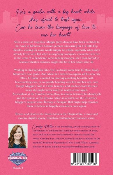 He's a goalie with a big heart, while she's afraid to trust again. Can he learn the language of love and win her heart? After a series of tragedies, Maggie Joly's dreams have been confined to her work at Montreal's botanic gardens and caring for her little boy. Besides, wishing for more would simply be selfish, especially when she's already loved well. But when a surprising workplace encounter sees her in the arms of a handsome sweet-talking stranger, she's soon forced to reassess whether romance might still be in her future after all. Working in this fairytale-like city is a dream come true for Beau Nash, Montreal's new goalie. And while he's enjoying learning the language of love, and excited to explore all his new city offers, he hadn't counted on meeting a striking brunette with heart-melting eyes, or so quickly bonding with her and her son, even though Maggie's faith is a little tenuous, and shadows from the past mean she might never really be ready to love again. An incident at the Gardens forces Beau to choose between his dream job and the woman of his dreams, while an accident on the ice invites Maggie's deepest fears. Perhaps a Pumpkin Ball might help convince them to believe in happily-ever-afters once again. Hearts and Goals is the fourth book in the Original Six, a sweet and swoony, slightly sporty, Christian contemporary romance series.