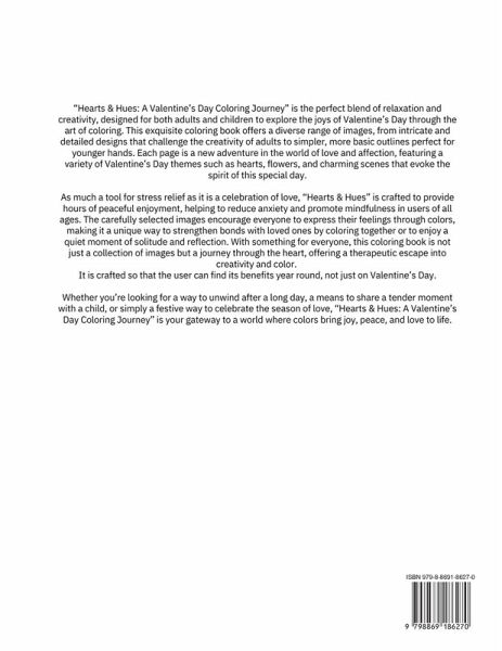 "Hearts & Hues: A Valentine's Day Coloring Journey" is the perfect blend of relaxation and creativity, designed for both adults and children to explore the joys of Valentine's Day through the art of coloring. This exquisite coloring book offers a diverse range of images, from intricate and detailed designs that challenge the creativity of adults to simpler, more basic outlines perfect for younger hands. Each page is a new adventure in the world of love and affection, featuring a variety of Valentine's Day themes such as hearts, flowers, and charming scenes that evoke the spirit of this special day. As much a tool for stress relief as it is a celebration of love, "Hearts & Hues" is crafted to provide hours of peaceful enjoyment, helping to reduce anxiety and promote mindfulness in users of all ages. The carefully selected images encourage everyone to express their feelings through colors, making it a unique way to strengthen bonds with loved ones by coloring together or to enjoy a quiet moment of solitude and reflection. With something for everyone, this coloring book is not just a collection of images but a journey through the heart, offering a therapeutic escape into creativity and color. It is crafted so that the user can find its benefits year round, not just on Valentine's Day. Whether you're looking for a way to unwind after a long day, a means to share a tender moment with a child, or simply a festive way to celebrate the season of love, "Hearts & Hues: A Valentine's Day Coloring Journey" is your gateway to a world where colors bring joy, peace, and love to life.