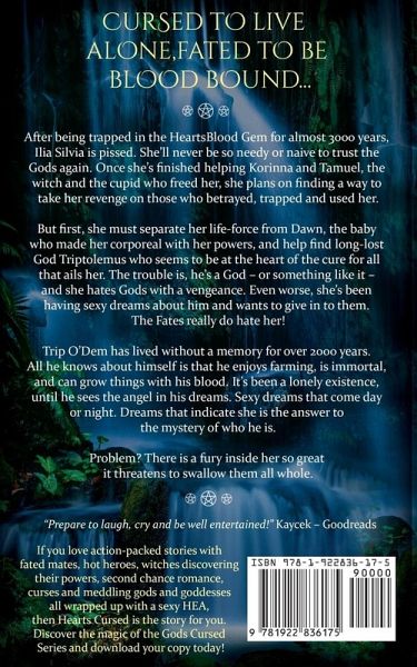Cursed to live alone, fated to be blood-bound ... After being trapped in the HeartsBlood Gem for almost 3000 years, Ilia Silvia is pissed. She'll never be so needy or naive to trust the Gods again. Once she's finished helping Korinna and Tamuel, the witch and the cupid who freed her, she plans on finding a way to take her revenge on those who betrayed, trapped and used her. But first, she must separate her life-force from Dawn, the baby who made her corporeal with her powers, and help find long-lost God Triptolemus who seems to be at the heart of the cure for all that ails her. The trouble is, he's a God - or something like it - and she hates Gods with a vengeance. Even worse, she's been having sexy dreams about him and wants to give in to them. The Fates really do hate her! Trip O'Dem has lived without a memory for over 2000 years. All he knows about himself is that he enjoys farming, is immortal, and can grow things with his blood. It's been a lonely existence, until he sees the angel in his dreams. Sexy dreams that come day or night. Dreams that indicate she is the answer to the mystery of who he is. Problem? There is a fury inside her so great it threatens to swallow them all whole. "Prepare to laugh, cry and be well entertained!" Kaycek - Goodreads "This is a page turner with totally unexpected twists and turns!" Margery - BookBub and B&N "I couldn't put this intriguing fated mates book down. I was enthralled! It kept me interested from the beginning till the very end of this intriguing story." Diana K - Goodreads "A great read and I can't wait to read the next part in their story. Well written and highly recommended." N Parker - Goodreads "This is the 1st time that I am reading anything by this author Leisl Leighton. I am avid fan of the paranormal. This is an entertaining read that held me captive." Joyce M. H. - Goodreads "The characters, storyline and world building really are amazing with lots of details which make for a fantastic reading experience." Tasha 1986 - Goodreads If you love stories with magic, beta heroes, witches, fated mates, enemies to lovers, curses and meddling gods and goddesses all wrapped up with a sexy HEA, then Hearts Cursed is the story for you. Discover the magic of the Gods Cursed Series and download your copy today.